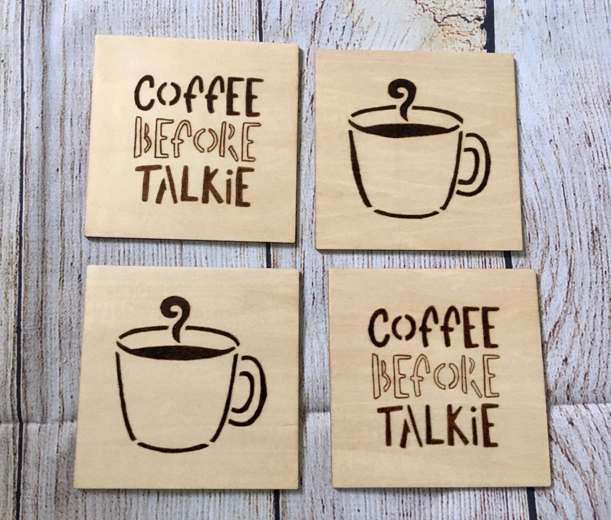 Coffee-Themed Wood Burned Coaster Set – Handmade Coffee Before Talkie Coasters – Set of 4 Rustic Drink Coasters