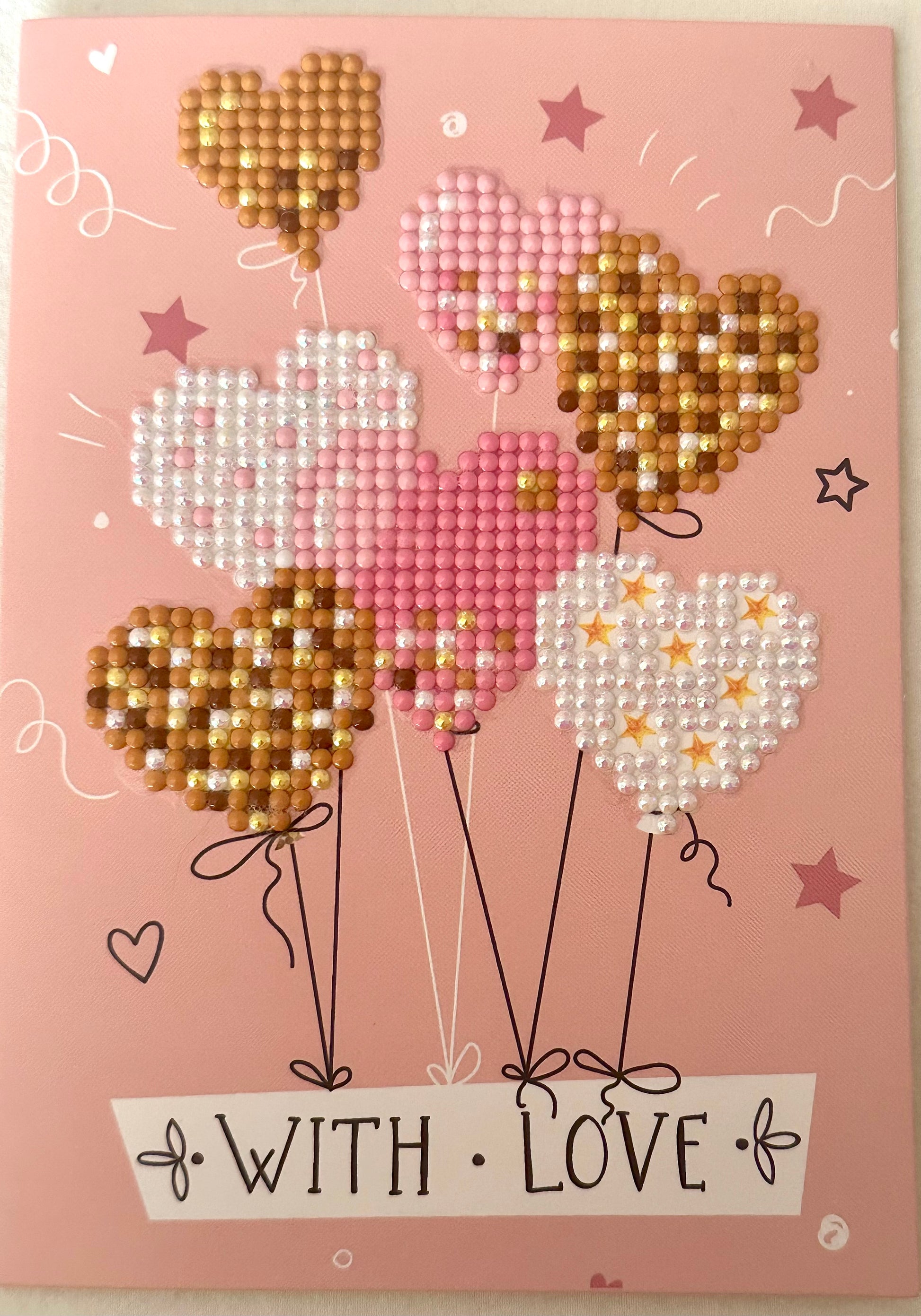Send your love in style with this handmade Heart Balloon Diamond Art Greeting Card. The front design features golden, pink, and white heart-shaped balloons brought to life with hand-applied diamond drills, creating a sparkling 3D effect. Perfect for birthdays, anniversaries, Valentine’s Day, or just because.